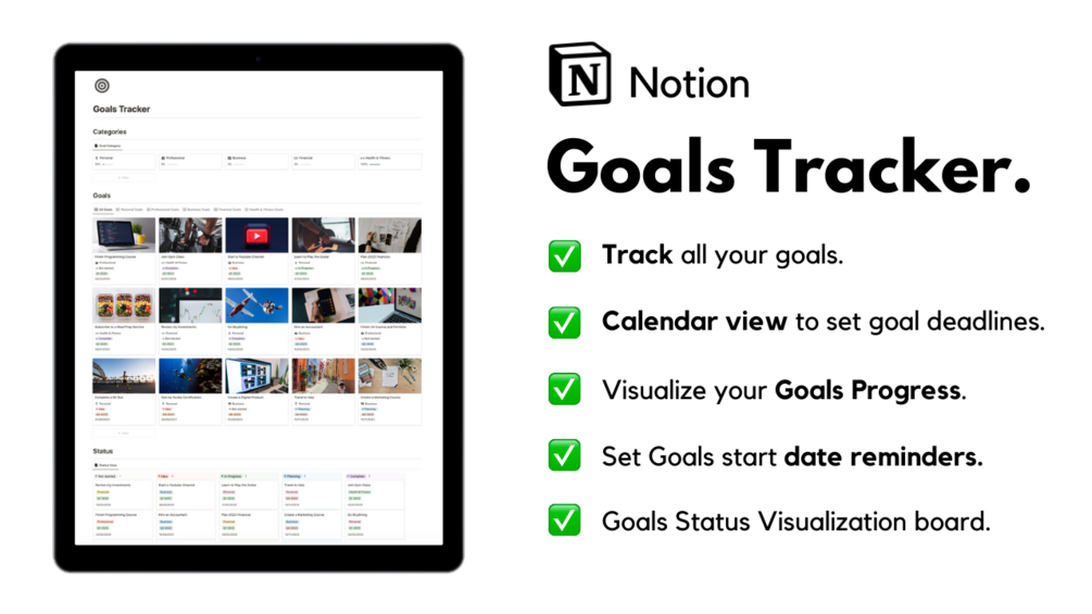 You'll get a Goals Tracker Notion Template to schedule and visualize the progress of your goals by category.